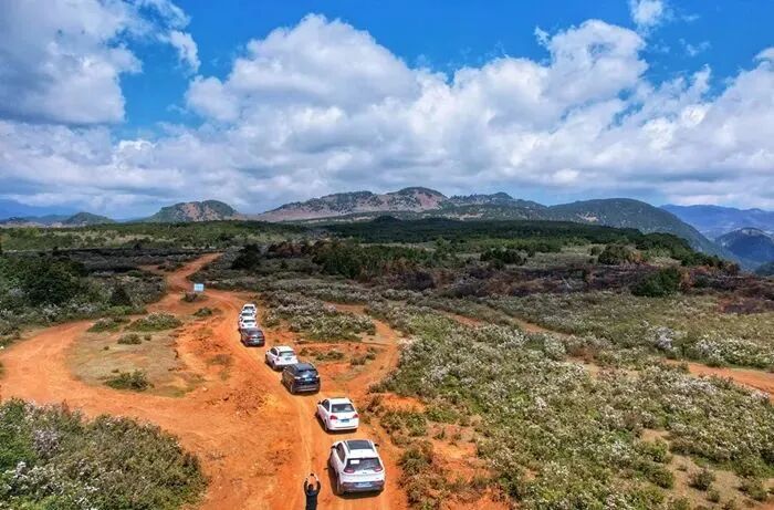 从德昌县城向西南方向出发,海拔不断攀升,沿着盘山公路车行约两小时进入了茨达镇营盘山,索玛花也由零星分布转为成片出现。到达山顶,漫山遍野的红色扑面而来,万亩索玛怒放成海,粉的白的紫的红的,各色花朵在枝头绽放,带来十分美妙的视觉感受。