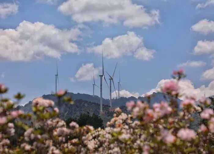 站在山顶看去,色彩绝伦的索玛花鲜艳夺目,错落有致的风力发电机在山脊迎风而立,蓝天、风车、青峰、红花、绿树,宛若人间仙境。
