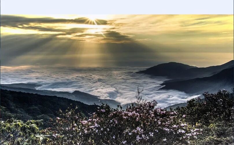 龙肘山还是观赏日出、云海、佛光的绝佳胜地,山顶远眺,霞光万丈,云腾雾涌,花在云中开,雾在花间飘,云雾与花海交映成趣,让人有超凡出尘飘飘欲仙的感觉。