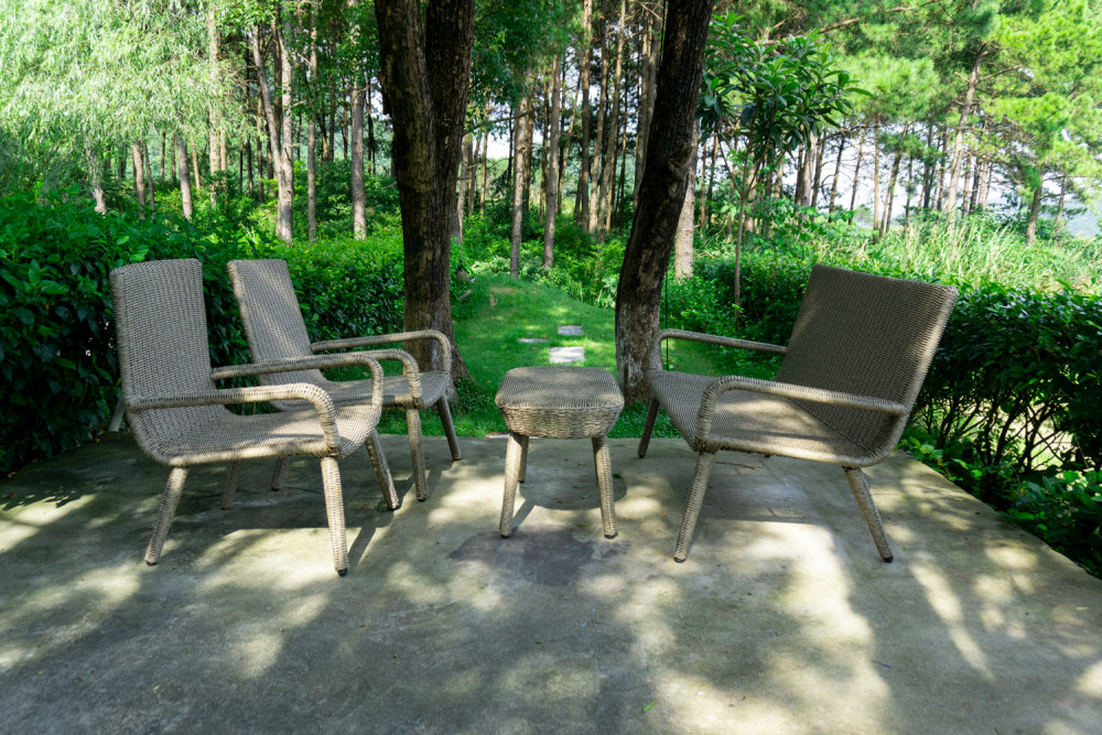 一家人围坐在庭院中 把酒言欢,与天地自然共享轻松、和乐的幸福美感