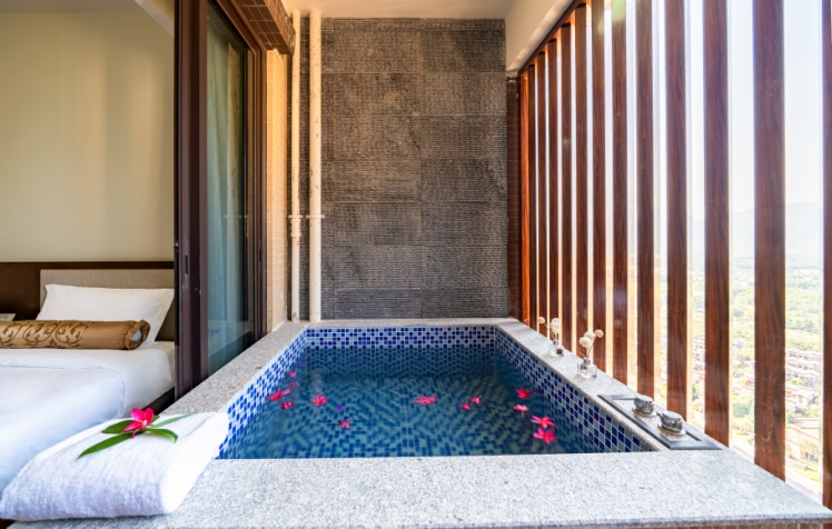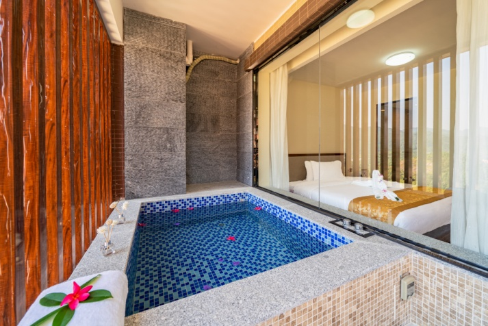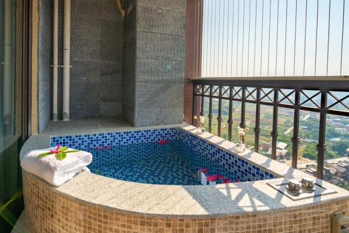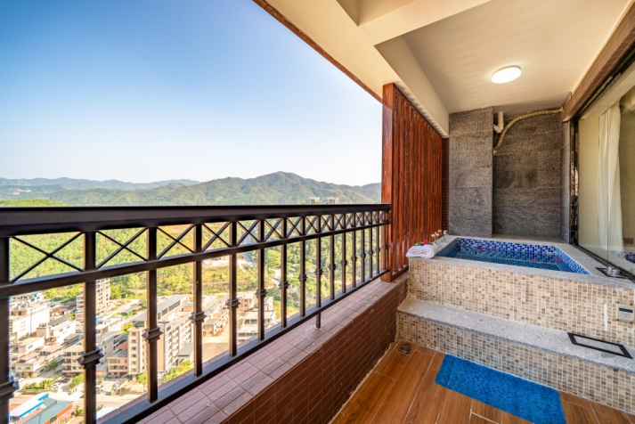 每套客房带大阳台泡池+楼下就是温泉爽泡