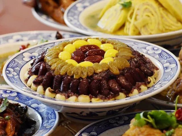 埇桥八大碗,是宿州地区红白席面的制式菜品,常见为七荤一素八道菜肴:富贵扣鸡、酥鱼扣碗、干菜扣肉、如意蛋卷、四喜丸子、虎皮扣肘、扦子扣碗、八宝甜饭。现为宿州市非物质文化遗产,具有浓厚的乡土特色,口感备受老百姓喜爱。