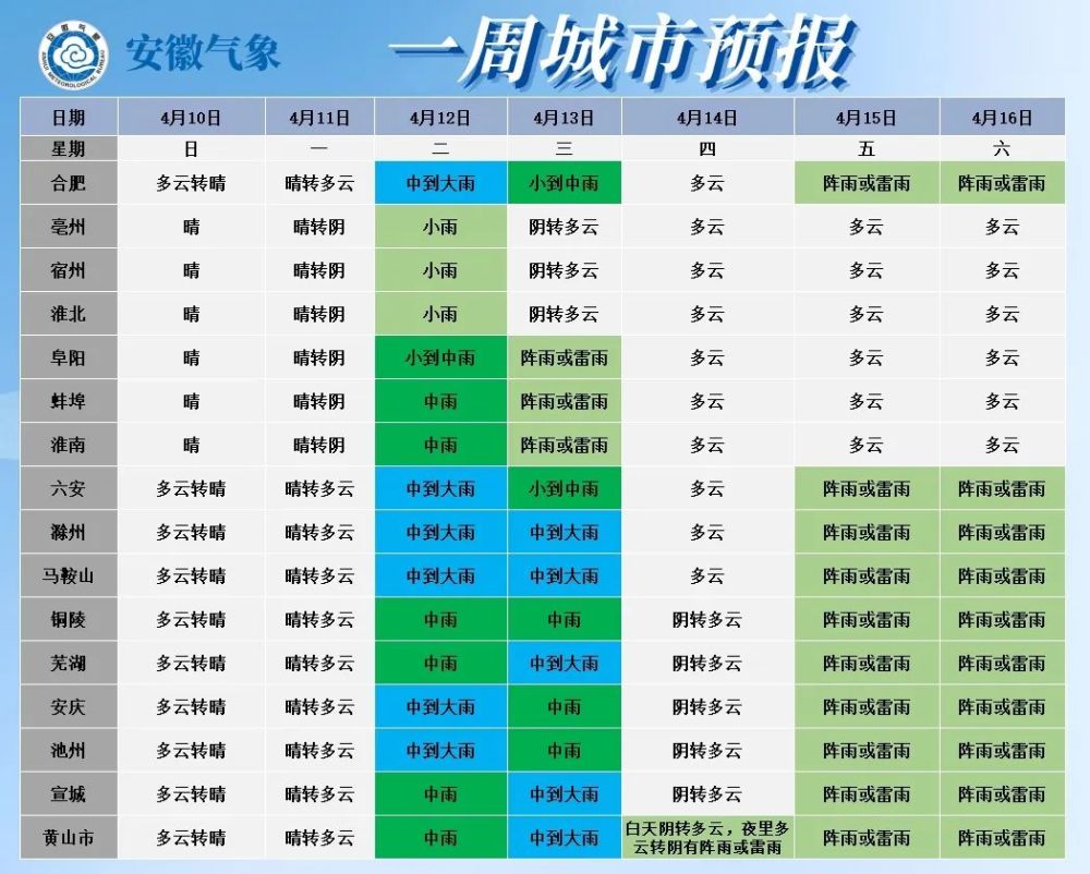 据安徽省气象台预报,11日大别山区局部有雷阵雨,夜里淮北地区北部有小雨。12日至13日我省有一次较明显降水过程,其中沿淮淮河以南部分地区有大雨,局部暴雨,并伴有局地短时强降水等对流性天气。14日夜里至16日淮河以南还有一次降水过程。