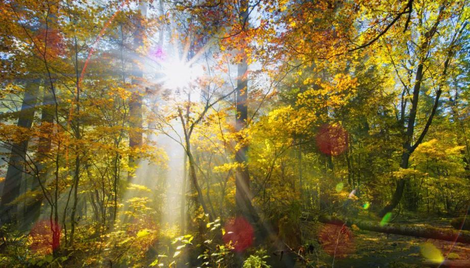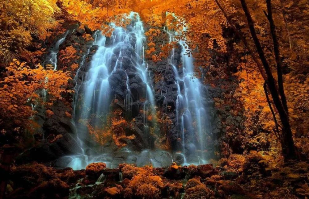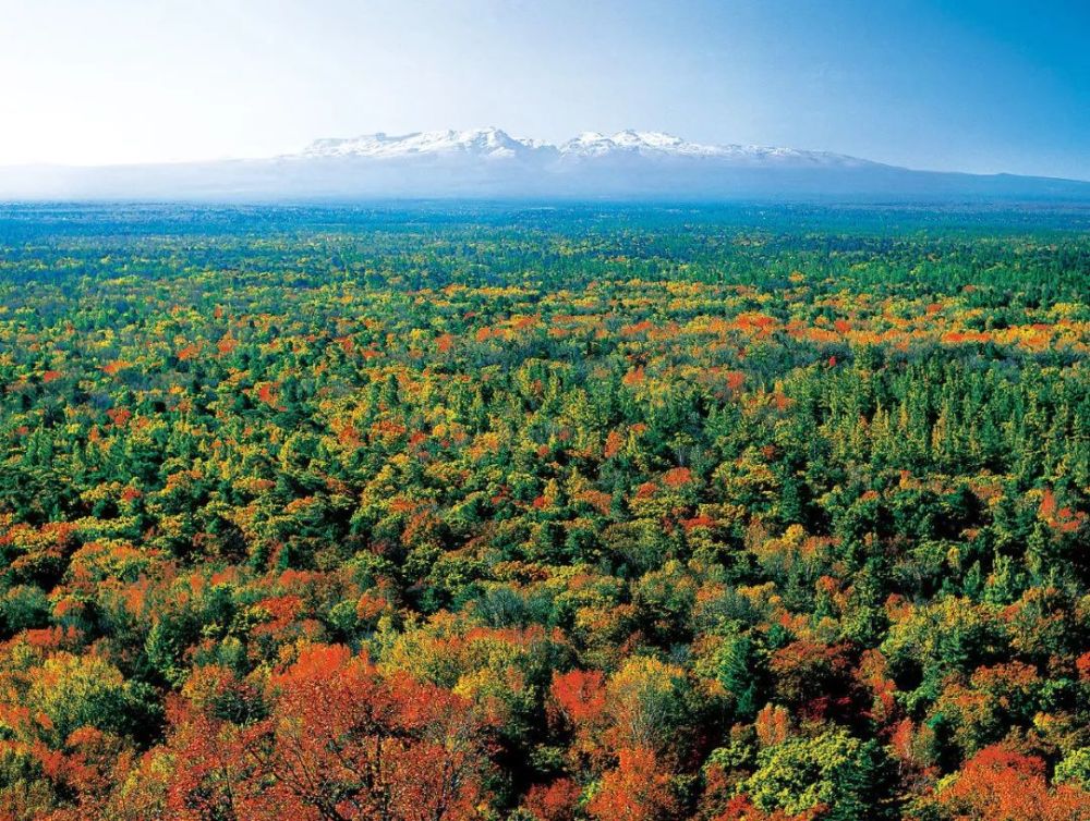 “每逢秋季,不同树种的树叶先后变色,映衬着远处白雪皑皑的山峰,共同打造出一个童话般色彩斑斓又纯净无比的秋来。”
