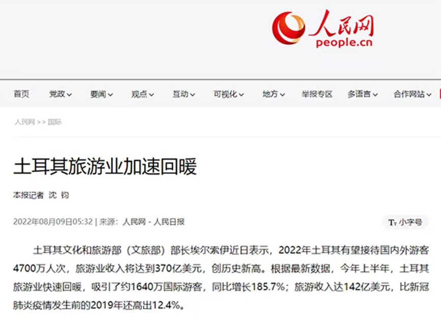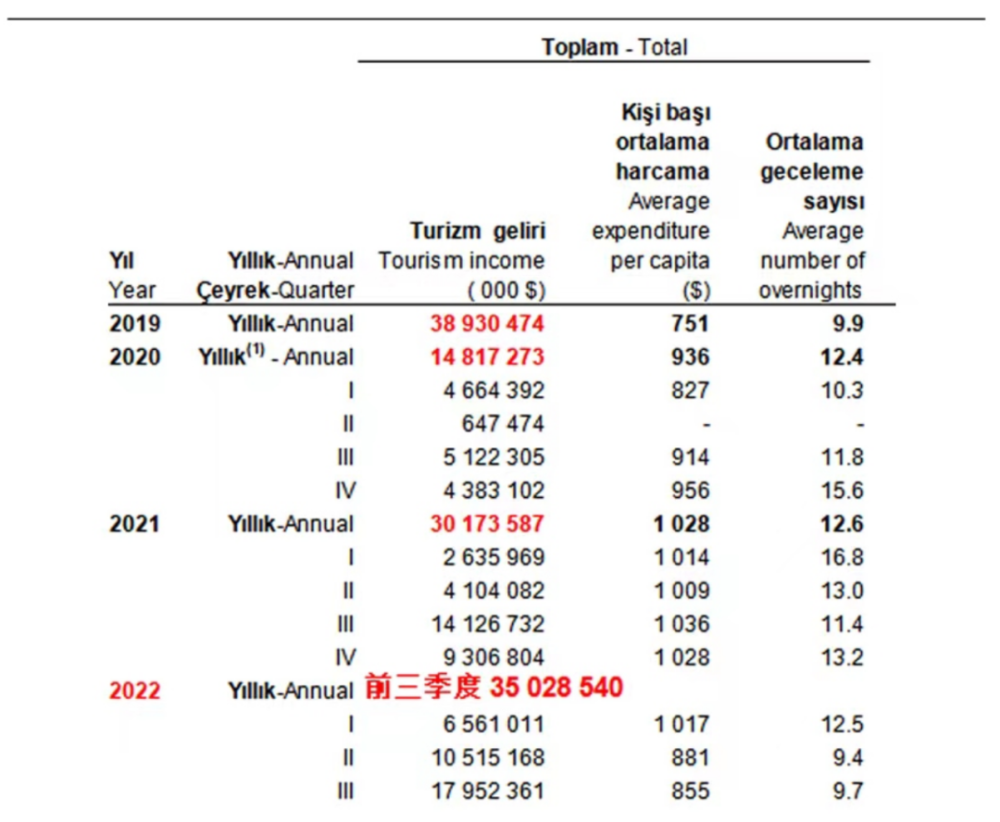 根据土耳其统计局数据显示,2022年前三个季度旅游收入达350亿美元。