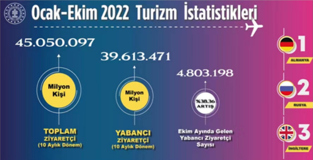 从客源市场来看,今年1月至10月的外国游客中,德国游客占比最高,以5,027,445人次排名第一,其次是俄罗斯,以4.632,712人次位居第二,英国以3.205.208人次位居第三,紧随其后的是保加利亚和伊朗。今年10月份,外国游客人数同比去年增长38.36%,达到4,803,198人次,表现亮眼。