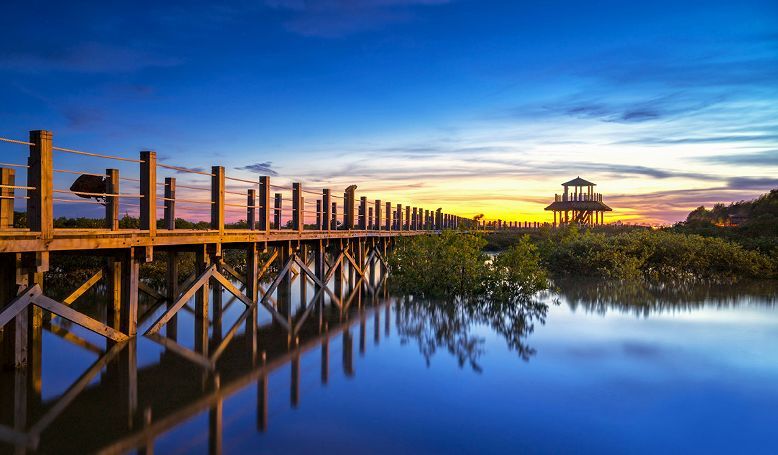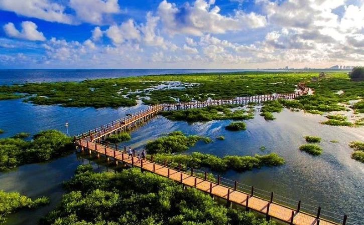 红树林是生长在海边沿岸的一种稀有的木本胎生植物,葱葱郁郁形成了美丽的“海上森林”,是北海一张靓丽的生态名片。成片的红树林也是海洋文化湿地景观带,踱步景观栈道,看得见树下活跃着贝、鱼、虾、蟹等生物,还可欣赏到群鹜飞天,红日白沙的诗意画卷。