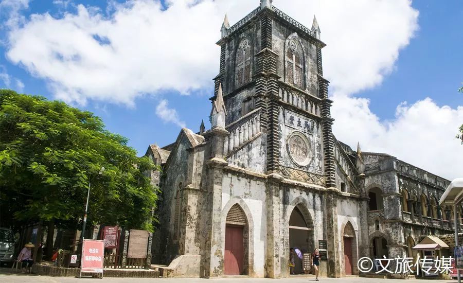 景区内最为显著的莫过于天主教堂。天主教堂是涠洲岛最著名的人文地标、国家级文物保护单位。教堂始建于1869年(同治八年),建筑材料主要就地取材,用当地的火山灰块石和珊瑚石等砌筑墙体,是艺术上较为完美又具有特色的建筑。这座典型的文艺复兴时期法国哥特式教堂,是晚清四大天主教堂之一,解放前是钦雷廉地区最早的天主教堂,是华南地区尚存最古老的天主教堂之一。