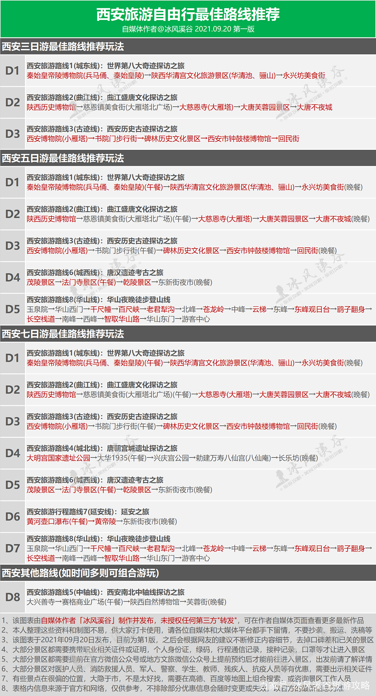 在中秋节和国庆节等节假日里去西安旅游的人,一般人的假期都比较有限,时间也异常紧张,那么每天的打卡行程就会比较紧凑,基本上都是起早贪黑,早出晚归,所以在如下的西安旅游行程攻略里,行程设计的内容也是比较紧凑的,大家只要参考西安旅游路线行程里设计的时间点、景点、参观内容、必吃美食、乘坐交通、防坑提示等内容打卡,就可以更完美的玩好西安各大主要景点了,该方案更适合年轻人和假期有限的人使用,那么,你喜欢哪条路线?