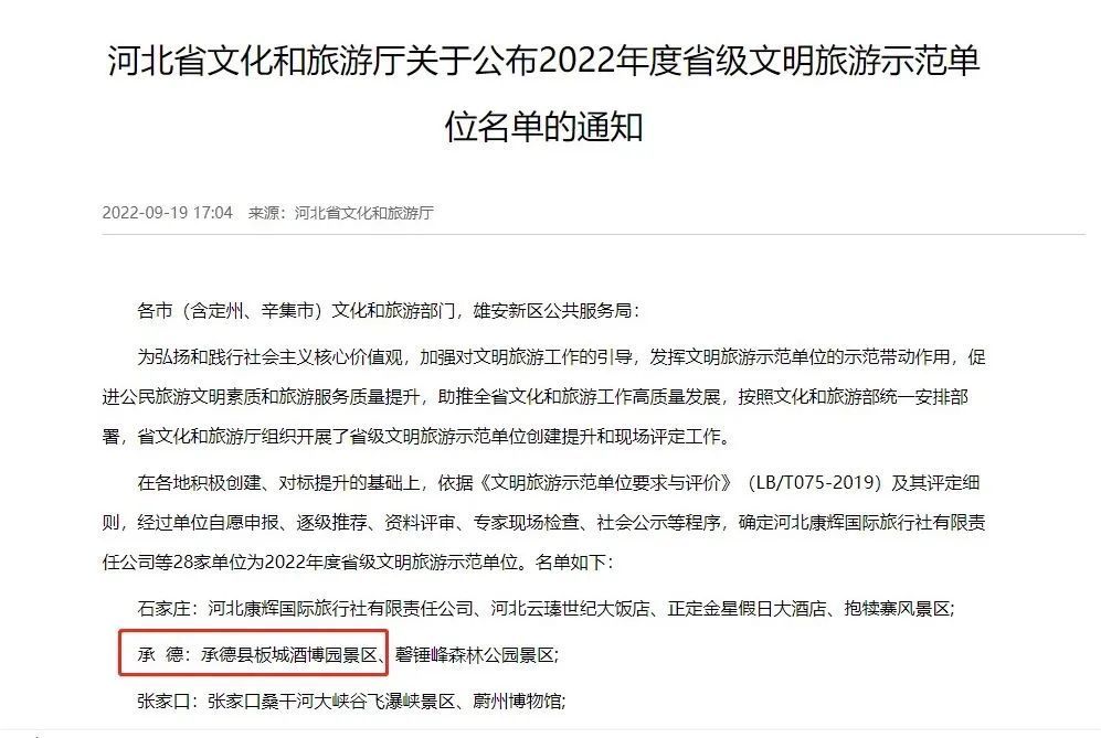 9月下旬,板城酒业【板城酒博园】景区被评为河北省2022年度省级文明旅游示范单位。