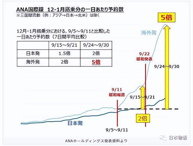就连10月11日至17日(全面放开入境后的一周),与上周相比,从海外到日本的航班预订数量也增加了30%,而日本国内出发的航班,也比去年同期翻了一番。