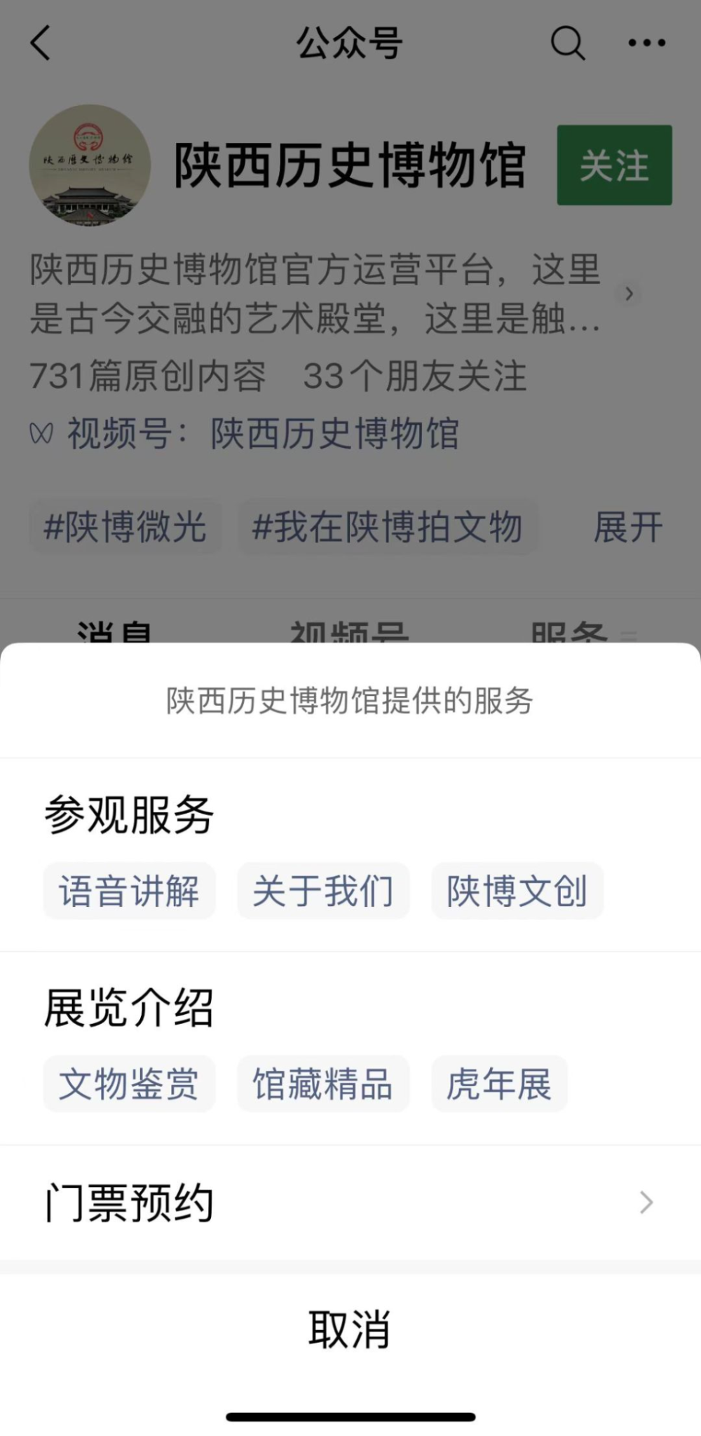 微信关注陕西历史博物馆公众号——选择服务可以看到参观服务、展览介绍和门票预约