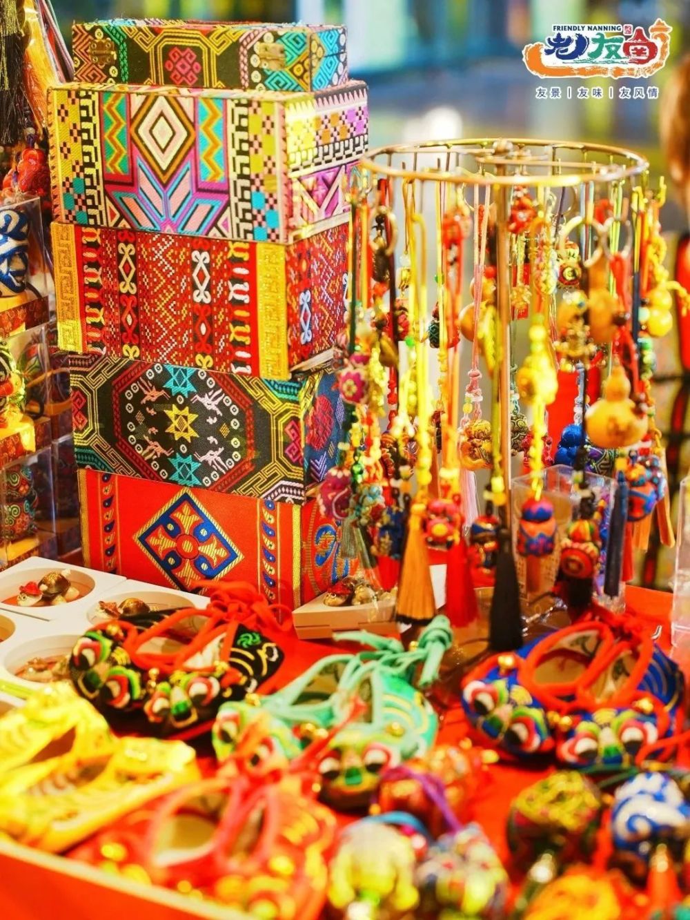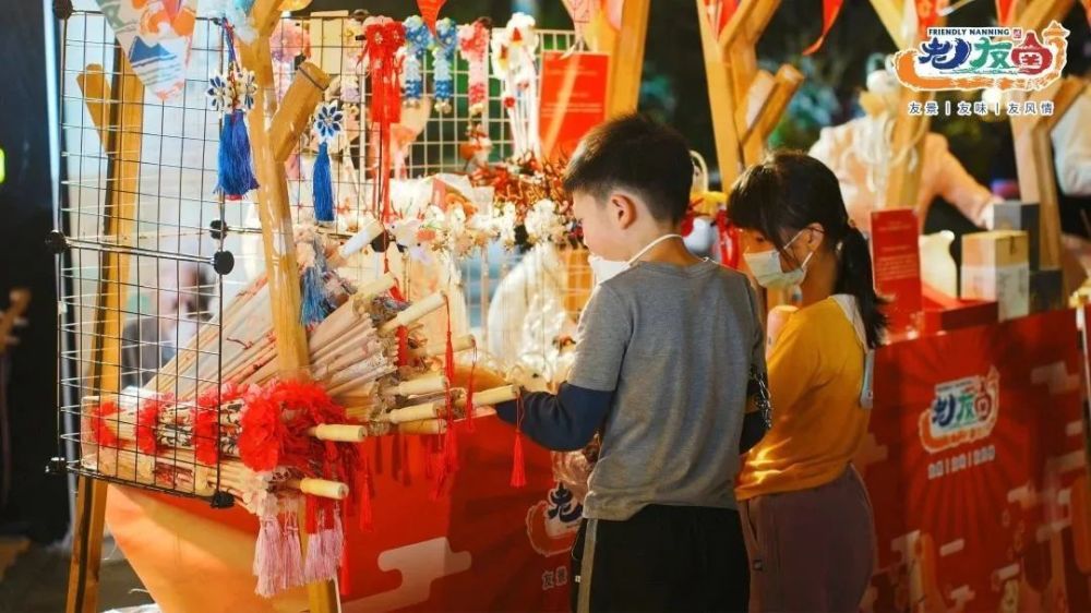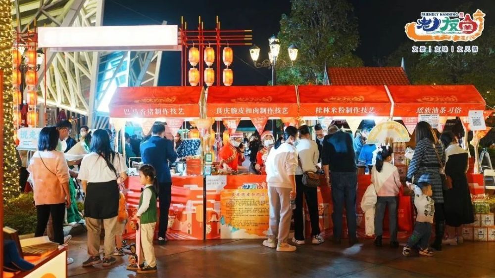 当晚,“老友南宁”非遗年货节也在南宁方特外广场拉开帷幕。30多个非遗市集展位集中展示、展演了巴马香猪制作技艺、良庆脆皮扣肉制作技艺、瑶族油茶制作技艺,以及壮族天琴、侗琵琶艺术等一批非遗项目。在非遗年货展销上,壮乡美食飘香,撩动游客的舌尖,“扬美三宝”、“多桂粽”、壮族五色糯米饭等特产年货应有尽有,方便大家一站式加购。“主办方通过丰富多彩的活动把非遗大礼送到市民身边,让‘非遗之美’可观、可触、可品、可赏。”市民孟女士对充满浓浓年味的非遗年货节赞不绝口。此次活动为期2天,开展5场非遗年货大礼包、方特金兔年票、南宁文旅消费券大礼包互动抽奖活动,为市民送出近2000份沉甸甸的南宁文旅“年货礼包”。