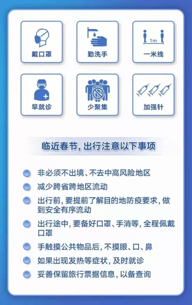 目前,国外新冠肺炎疫情高发,国内多地出现新冠肺炎本土疫情,局部地区出现本土聚集性疫情,部分城市发现奥密克戎变异毒株感染的本土病例并出现社区传播,防控任务艰巨。春节临近,人员流动加剧,疫情传播风险增大。为严格落实“外防输入、内防反弹”的防控策略,严防我市出现关联病例,宿州疾控发出以下健康提示: