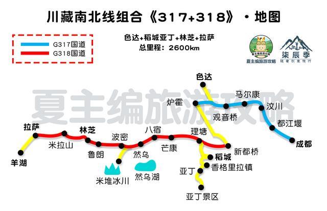 如下图所示,红色的线路代表318川藏线,青色的线路代表109青藏线。所谓“川进青出”,就是去西藏时走川藏线,返回时走青藏线。往返一共5000余公里,自驾需用时16日左右。
