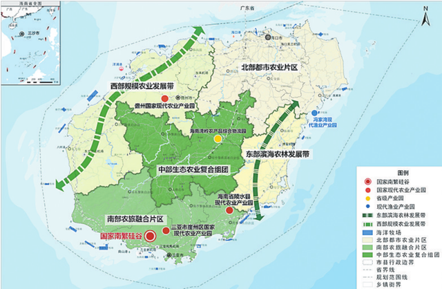 “十四五”时期,海南省优化农业空间格局,构建北部都市农业片区、南部农旅融合片区、东部滨海农林发展带、西部规模农业发展带、中部生态农业复合组团和配套加工物流组团。