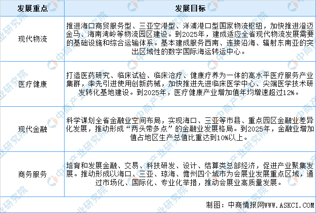 “十四五”时期,海南省以现代物流、医疗健康、现代金融、商务服务为发展重点,对标国际最高开放水平,构建海南自由贸易港现代服务业体系。到2025年,现代服务业增加值占服务业比重达到54%,占地区生产总值比重达到35%以上。