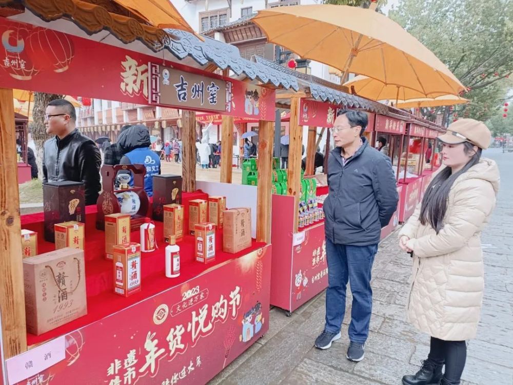 活动启动后,人们纷纷来到非遗集市年货悦购节活动现场。只见高高挂起的红灯笼连同40余个展柜把非遗广场装饰得年味十足。展柜上展示陈列着永新和子四珍、永丰菊花石雕、井冈翠绿茶、万安茶油、遂川板鸭、泰和县蜀口茶、吉州老杨家家烧、峡江米粉、青原东固传统造像、安福樟木箱、新干赣酒、吉水水南腐竹、九江湖口糟鱼、萍乡傩文化文创、南昌手工挂面、莲花血鸭、新余牛皮鼓、赣州客家服饰、抚州南丰傩面具等本土和兄弟市(县)传统技艺、美术类非遗项目产品。和着《梨花颂》《盛世欢歌》《国风》等欢快激扬的音乐,展棚前的游客越来越多,人们纷纷了解查看选购心仪的非遗产品。一位参与活动王女士高兴地说:“虽然今天天气很冷还下着雨,但是今天景区的活动丰富多彩,既好看,又好听,还好玩!最高兴的是,能在家门口买到来自全市各县和全省其他市的非遗特色产品、年货,真是太开心了!这个小年过得太有意思了!”
