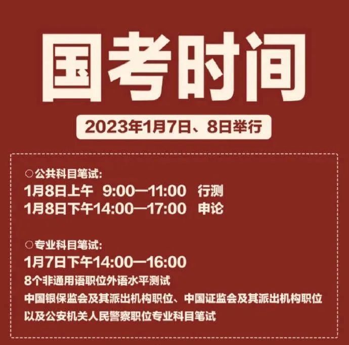 2023年国考于1月7日、8日举行。我市报考者可于2023年1月3日0:00至1月8日15:00期间,登录“中央机关及其直属机构2023年度考试录用公务员专题网站”打印准考证。