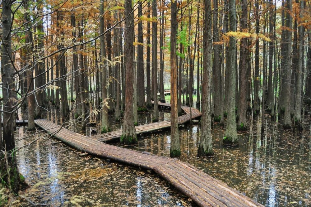 除了那清澈碧绿的湖水外,往深处走去还可以看到一片郁郁葱葱的水杉林,水中的水杉林非常高大、遮天蔽日,置身其中,犹如走进了一座森林王国中,满眼的葱翠,非常的养眼。在这片水杉林中有一条池林栈道,号称“南京九寨沟”,为将军山最具代表性的景点,栈道蜿蜒曲折的伸向水杉林深处,走在栈道之上,看着眼前的美景,有一种寻幽探胜的感觉。