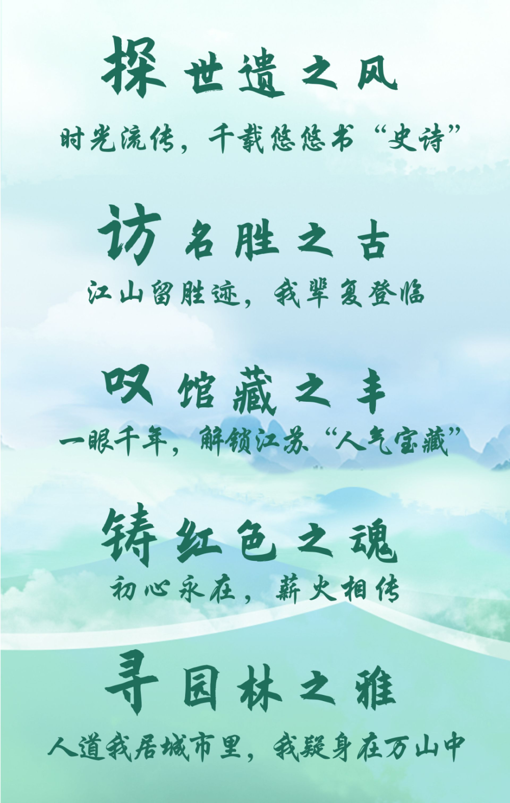 江苏有文韵悠长的历史画卷,文物古迹、非遗产品、老字号、老品牌、传统村落等文化瑰宝遍布全省各地,现有世界文化遗产3处,人类非物质文化遗产代表作名录10项。文脉流长,书写江苏“美的人文”。