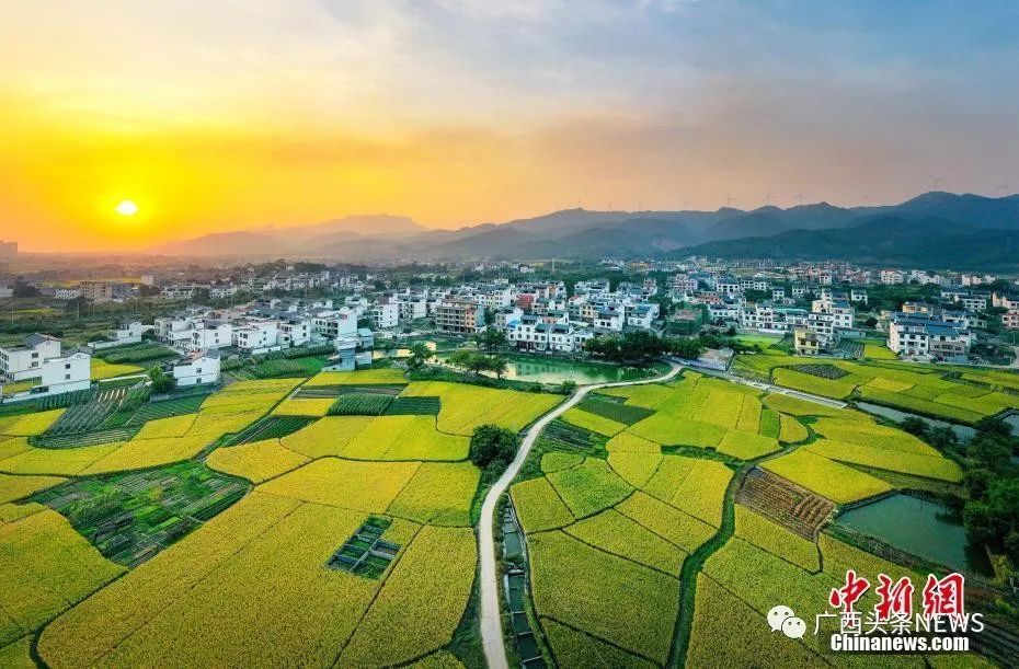 贵港市一村庄田间一派丰收景象,金色田野与错落的村庄相映成趣,构成一幅金光灿烂的美丽乡村田园画卷。张庆杰 摄