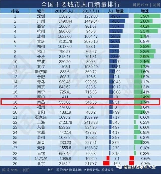 从上面的表格中可以看出,南昌市的人口增幅已经将近10万,排名在全国的第18位,增速则是1.74%,也算是比较高的速度。