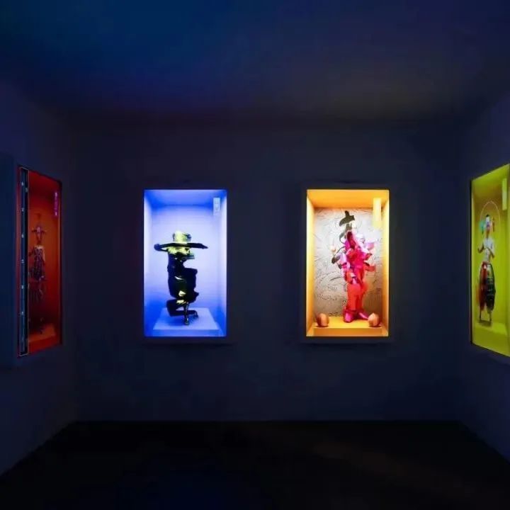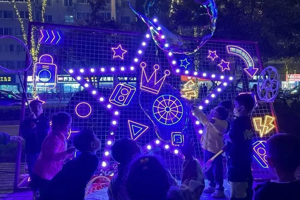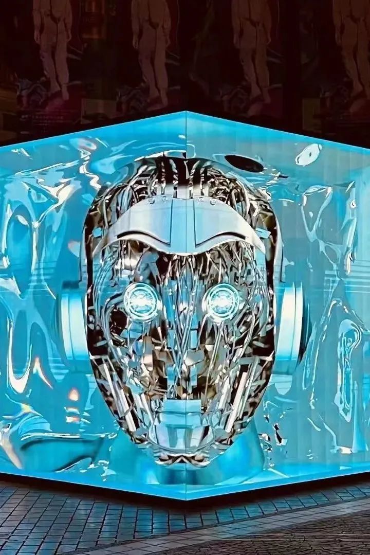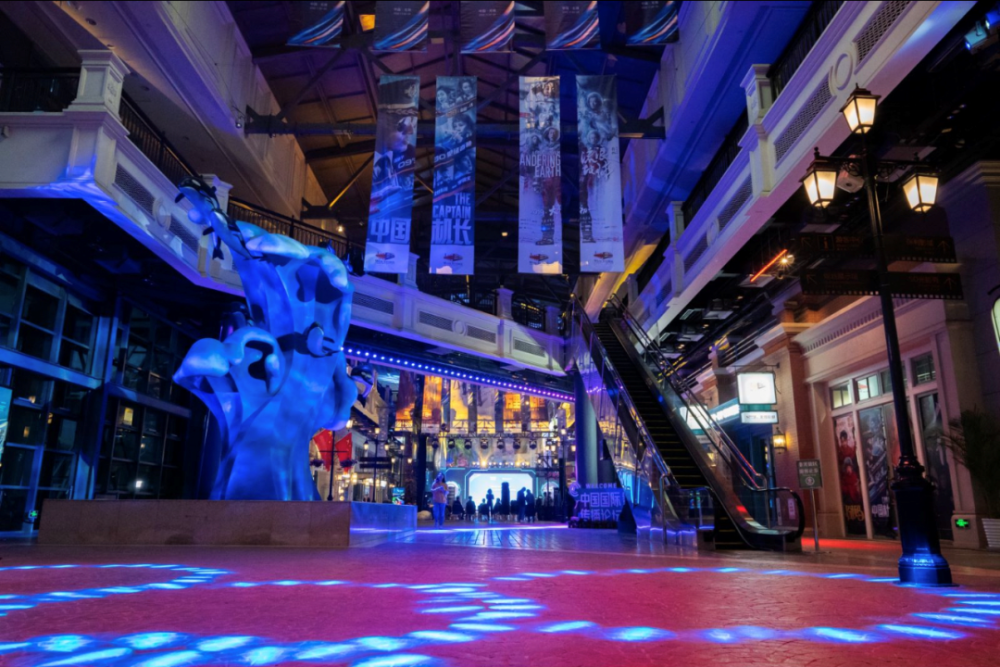 街区集结30位国内知名元宇宙艺术家的近50件作品,将数字虚拟影像与现实场景融合,形成虚实共生的数字互动娱乐场景,灯光、投影、喷雾、水纹等,打造了元宇宙世界的概念,就像走进科幻电影。