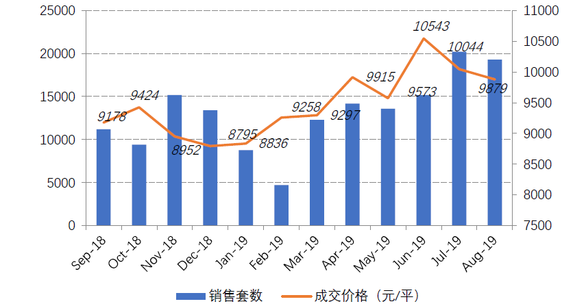 从春节结束后的3月份开始,全市商品住宅成交套数稳步攀升,7月份单月成交2万余套,为近两年月度成交量的最高水平。与此同时,商品住宅成交价格也不断提升,由2018年下半年的9000元/㎡左右,升至6月份的最高值10543元/㎡,涨幅约为15%。