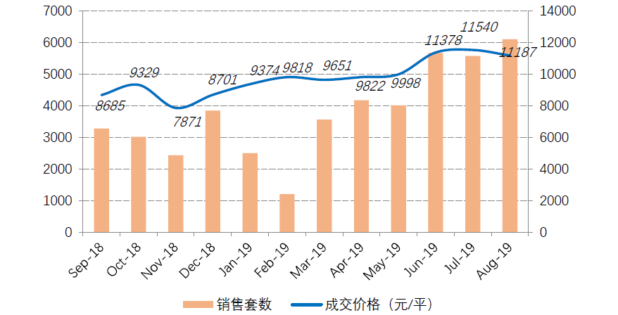 在全市整体市场回暖的带动下,沈阳南部城区住宅市场的成交情况也逐月提升,成交量由2018下半年每月的2000-3000套,提升至2019年8月的超过6000套,住宅成交价由2018年9月的8685元/㎡,提升至今年8月的11187元/㎡,涨幅近30%,为全市平均价格涨幅的二倍。