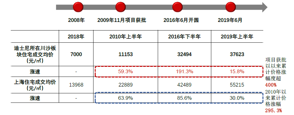 未来世界顶级童话神话乐园“恒大童世界”的成功落成运营将对项目长期价值有显著带动效应。通过对一些国内外典型主题乐园进行分析发现,大型游乐园对区域人口集聚、配套提升、消费升级等均有助推作用,从而对周边项目房价实现保值增值起到重大推动作用。以上海迪士尼为例,自2009年11月项目获批以来,截至2019年上半年其所在的川沙板块住宅成交价格涨幅超400%,远超上海市整体房价上涨速度。