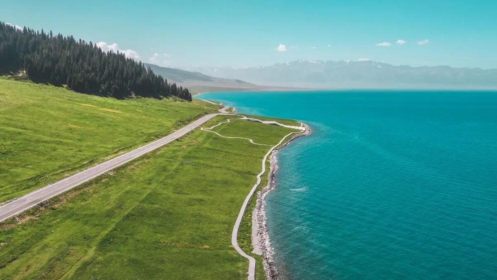 1.每年的5 6月份湖边牧草原如茵,一个个毡房像星星一样撒在湖边,草原上开满各色花朵,湖面湛蓝,远处雪山环绕犹如人间仙境。
