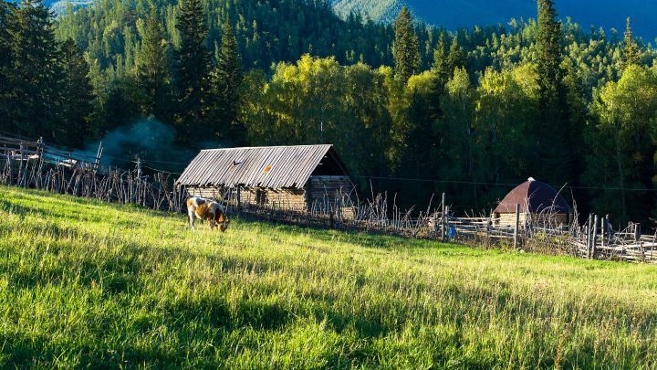 白哈巴是个原始自然生态与古老传统文化共融的村落,一切都还保存着几百年来固有的原始风貌,以图瓦人为主,位于阿尔泰山山脉的山谷平地上,与哈萨克斯坦的大山遥遥相望,阿尔泰山上密密麻麻的金黄金黄的松树林一直延伸到白哈巴村里,村民住的木屋和圈养牲畜的栅栏错落有致地散布在松林和桦林之中,安宁、祥和 。