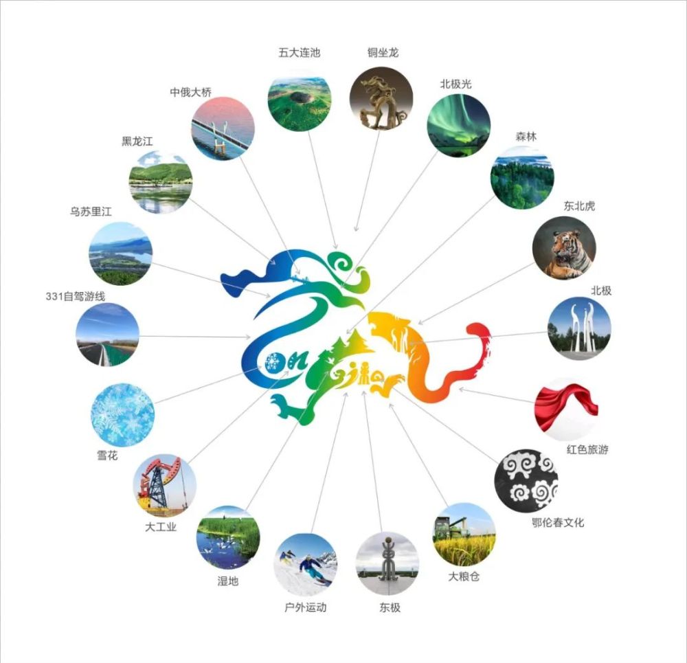 龙头部分融入五大连池、黑龙江、乌苏里江和极光元素,通过写意的手法将三者的轮廓特点与LOGO整体结合;在龙头处加入一带一路黑河中俄大桥的轮廓形象;龙颈处选用了代表黑龙江冬季旅游的雪花、象征“大庆精神和铁人精神”的大工业以及有着“醉美龙江331边防路”元素。