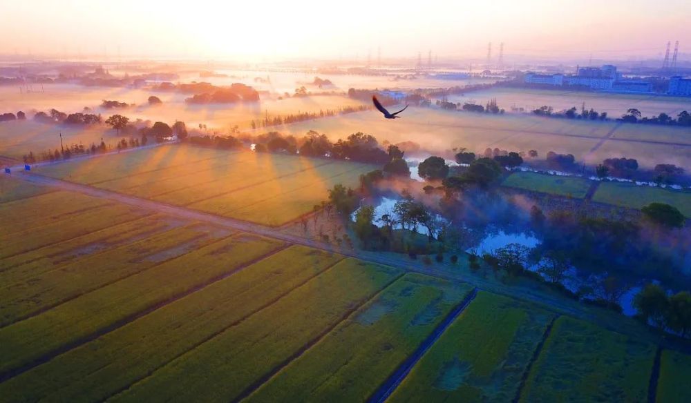 田园景观:长漾湿地风光,齐心稻香良田,龙虾养殖基地。