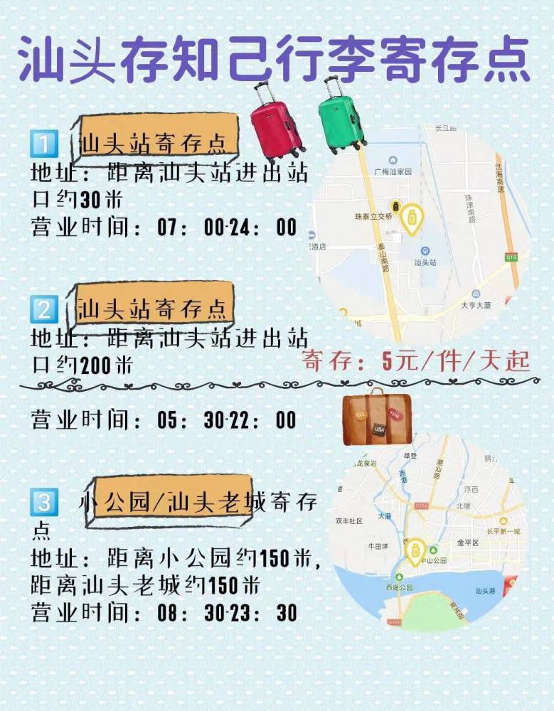 可以用“存知己寄存”,汕头火车站、汕头小公园等景点附近都有行李寄存点,行李寄存费用是5元/件/天起。