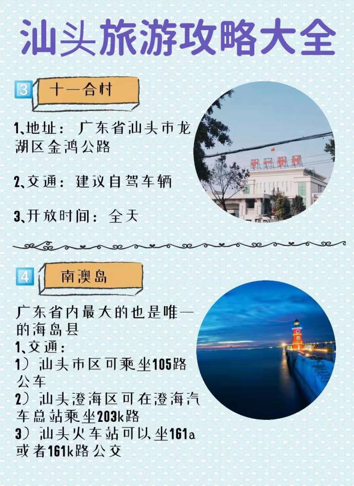 南澳岛、观海长廊、1860文化创意园、海湾湿地公园、欧美城文化小镇、南澳大桥、青云岩风景区