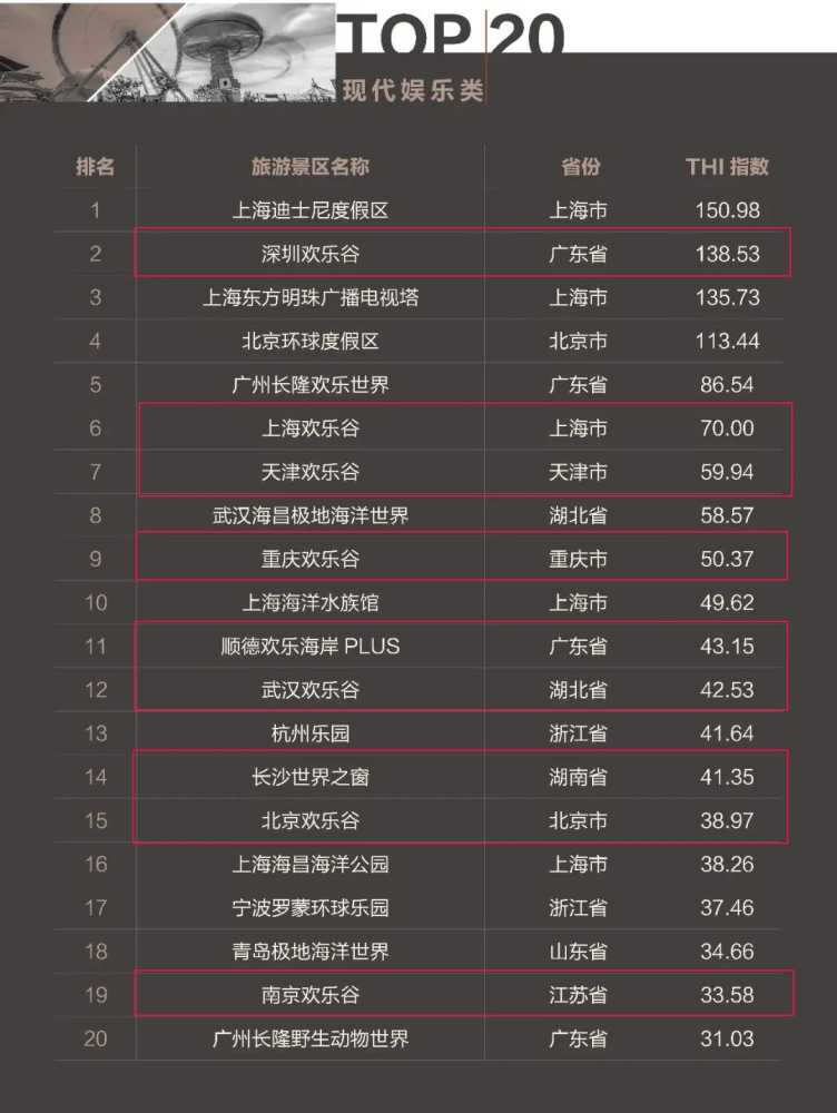 ▲2021年11月中国现代娱乐类旅游景区欢乐指数(THI)排名