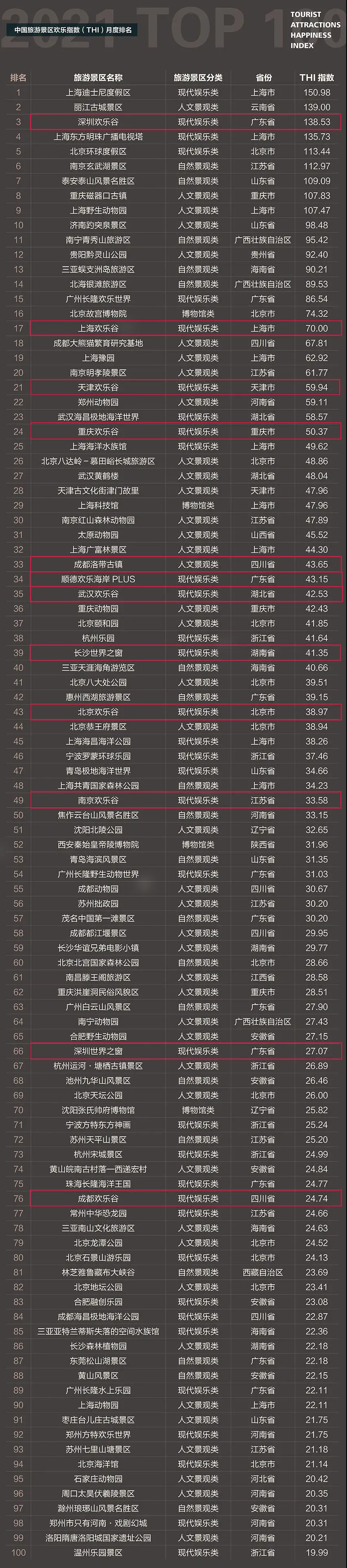 ▲2021年中国旅游景区欢乐指数(THI)11月份排名TOP100