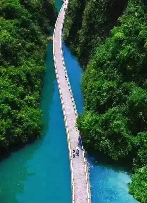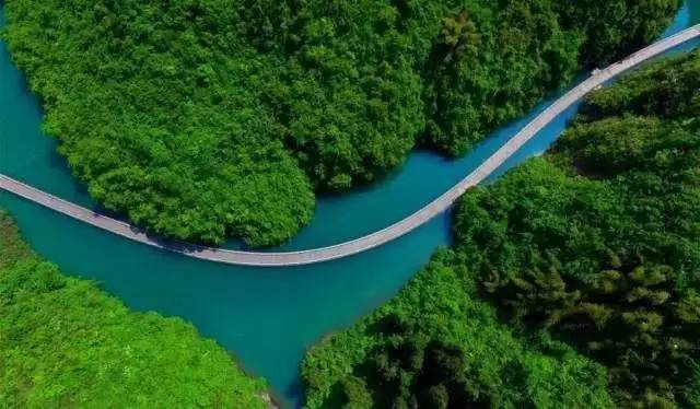 漂浮式水上栈道长约500米,行走其上,青山绿水,悠悠荡荡,陶然自得。顺着蜿蜒的河道建设而成,让人行走在青山绿水间,感受土苗山乡大自然的魅力。