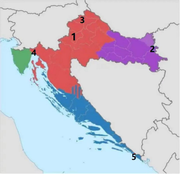 克罗地亚大致上可以分成四个地区:东北部的斯拉弗尼亚地区、首都札格雷布附近的克罗地亚中央区、西北部的伊斯特拉地区、西南部的达尔马提亚地区。