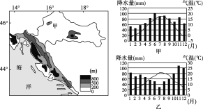 克罗地亚橄榄油、葡萄酒等农产品以其绿色天然的品质享誉欧洲。目前,该国正在积极申请农产品欧盟地理标志认证。下图为克罗地亚地形示意图和甲、乙两城市气候资料统计图。