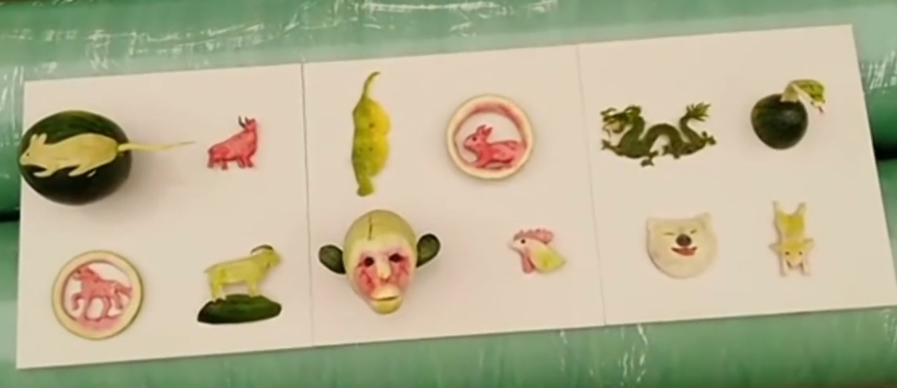 7月29日,河南开封58岁的余大爷通过网上自学,利用下班空闲的时间来做雕刻,花费了5天的时间雕刻出十二生肖。大爷说:选用无籽西瓜,更容易定型。像蛇这种造型简单的比较容易雕刻,老虎会相对来说难一些。
