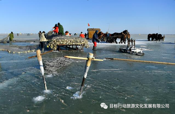 个冰窟窿,然后穿杆引线。下网时,由于网太长,每隔一定的距离,他们都要使用马拉绞盘拉动大网,才能将大网逐步下到位,仅下网的过程就需要八九个小时。