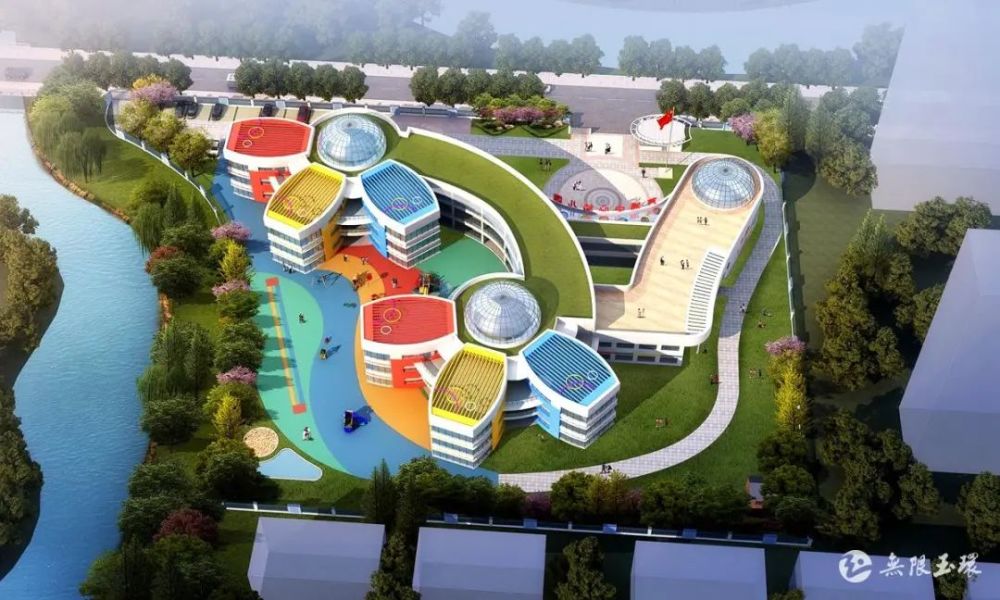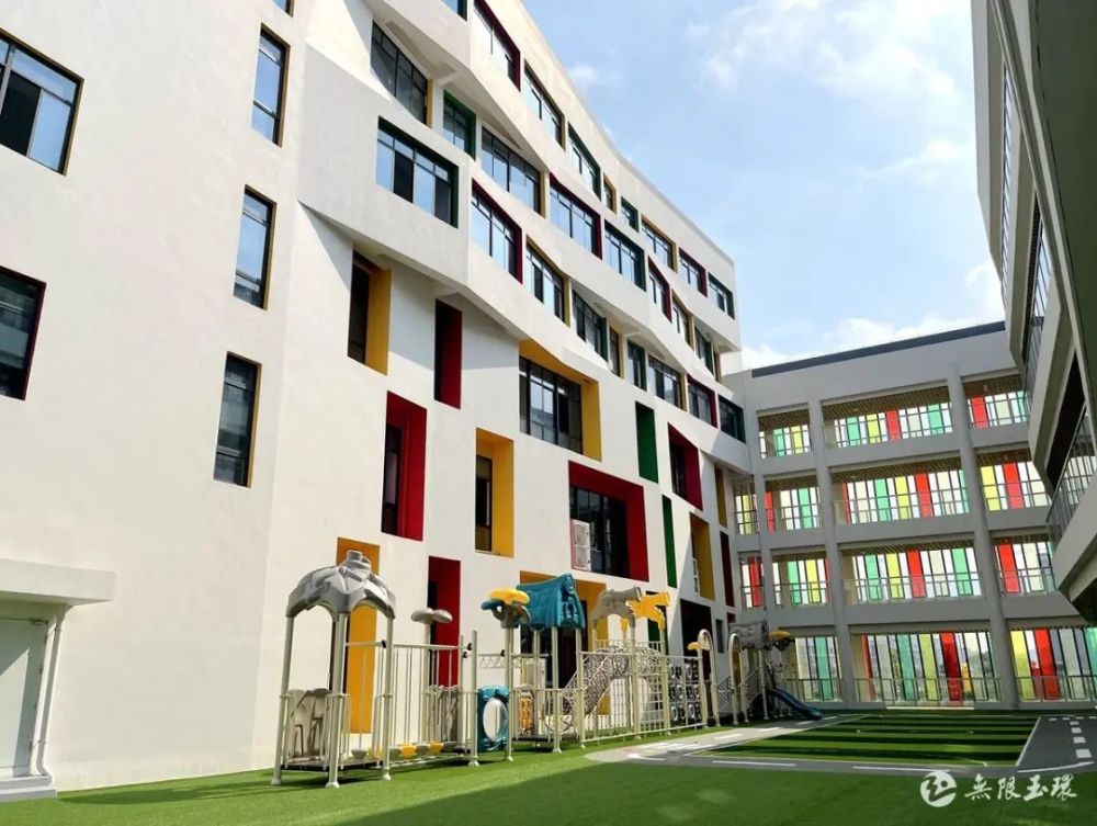 整个建筑布局形似阿拉伯数字“9”,共3层,有15个配套教室和6个专用功能房,室外还配有跑道、水池、屋面斜坡滑道、草坪、游乐设施以及花草植物园等,可以让孩子们尽情的玩耍、探索。