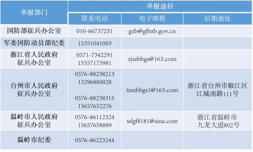 为防止和纠正征兵工作中的不正之风,畅通信访举报渠道,保障群众监督权利,温岭市人民政府征兵办公室设置了举报电话和投递信箱。现将国防部、浙江省、台州市、温岭市廉洁征兵监督举报电话、举报信箱和温岭市本级廉洁征兵监督员进行公示,欢迎社会各界对征兵工作进行监督。
