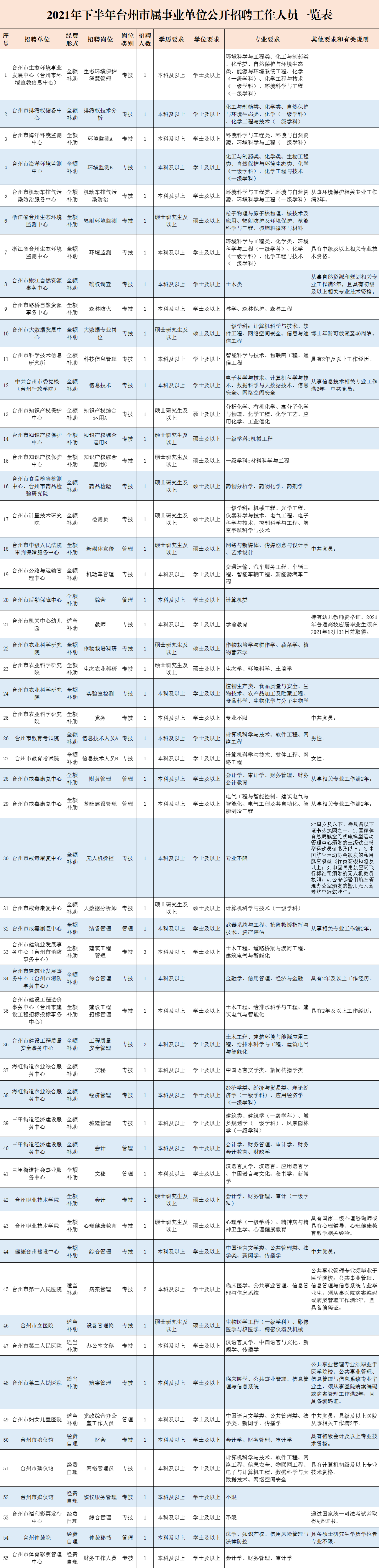 具备与招聘岗位要求相适应的学历、专业、任职资格、职业(执业)资格及技能等条件,以《2021年下半年台州市属事业单位公开招聘工作人员一览表》为准,其中有学位要求的岗位,学位须与所要求的学历相对应。