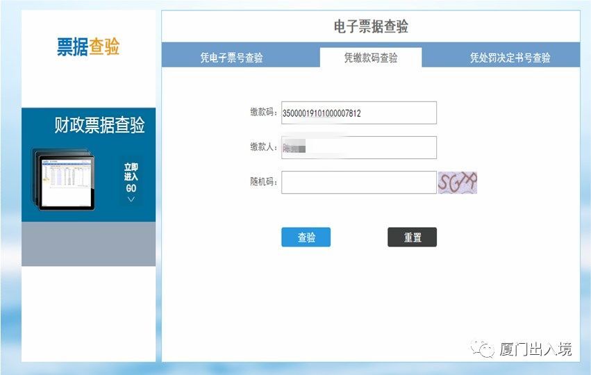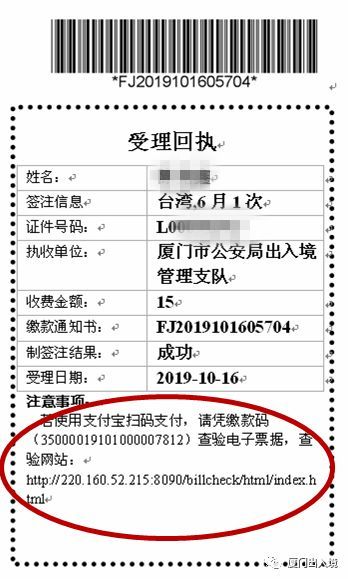 申请人在自助办证一体机上办理签注业务并用支付宝成功缴费后,自助办证一体机出具的回执单上会打印本次办理业务对应的缴款码,以及“福建省非税收入和财政票据公共服务平台”网址(http://220.160.52.215:8090/billcheck/html/index.hml),提示申请人凭缴款码,按省财政厅有关规定自行验证、打印电子票据。