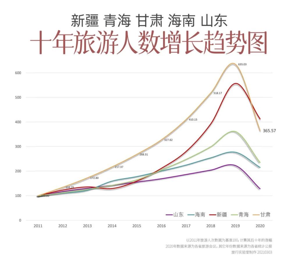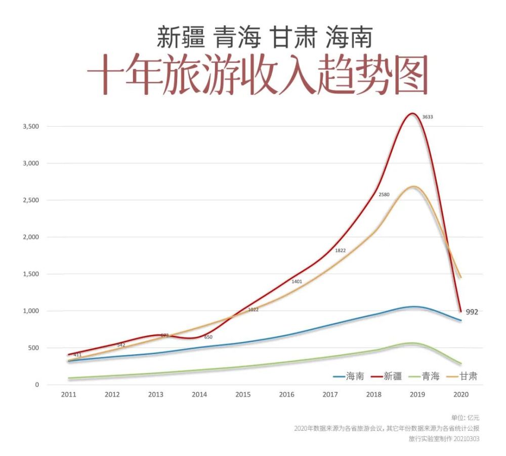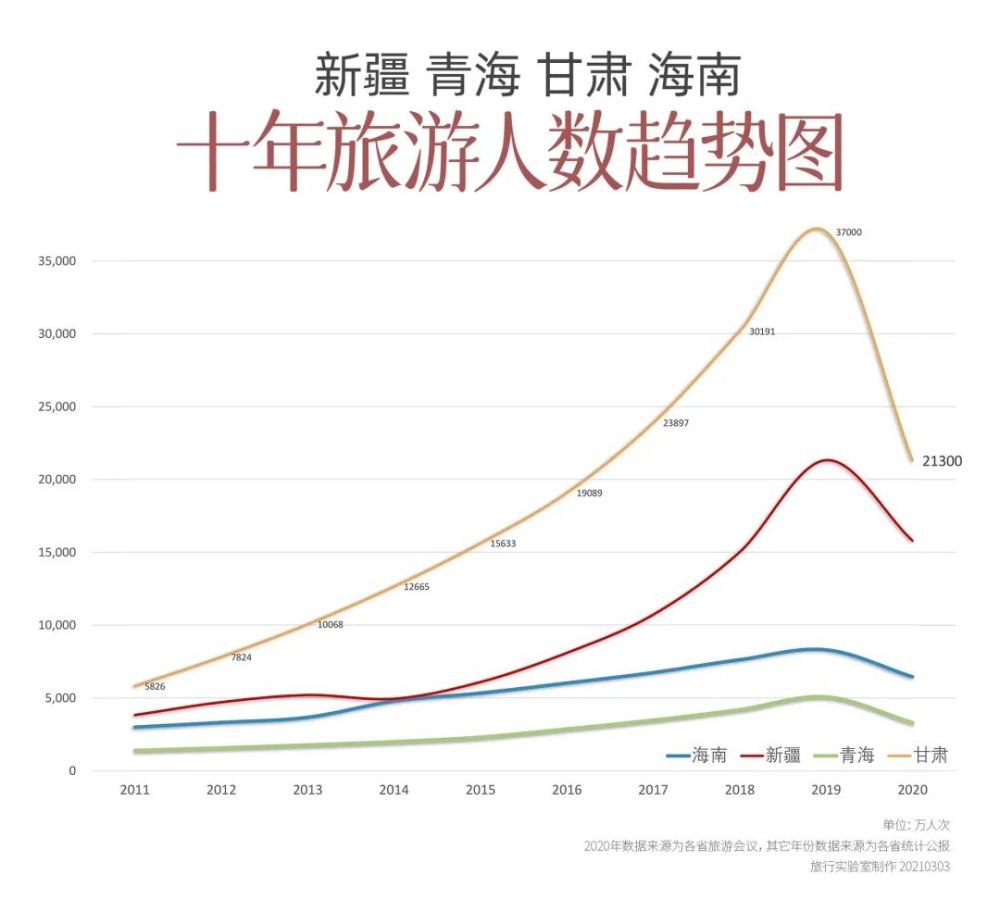 西北三省中青海环境恶劣、生态脆弱,保护大于开发,旅游发展一直受限。而甘肃和新疆的增长都十分可观。甘肃十年前就已经在崛起了,而新疆在摆脱了不稳定因素后,也是一路高歌猛进。