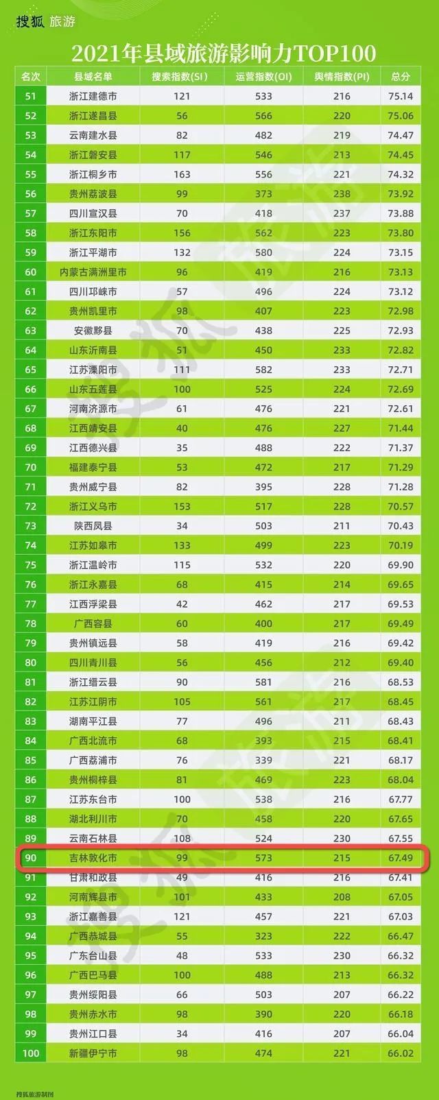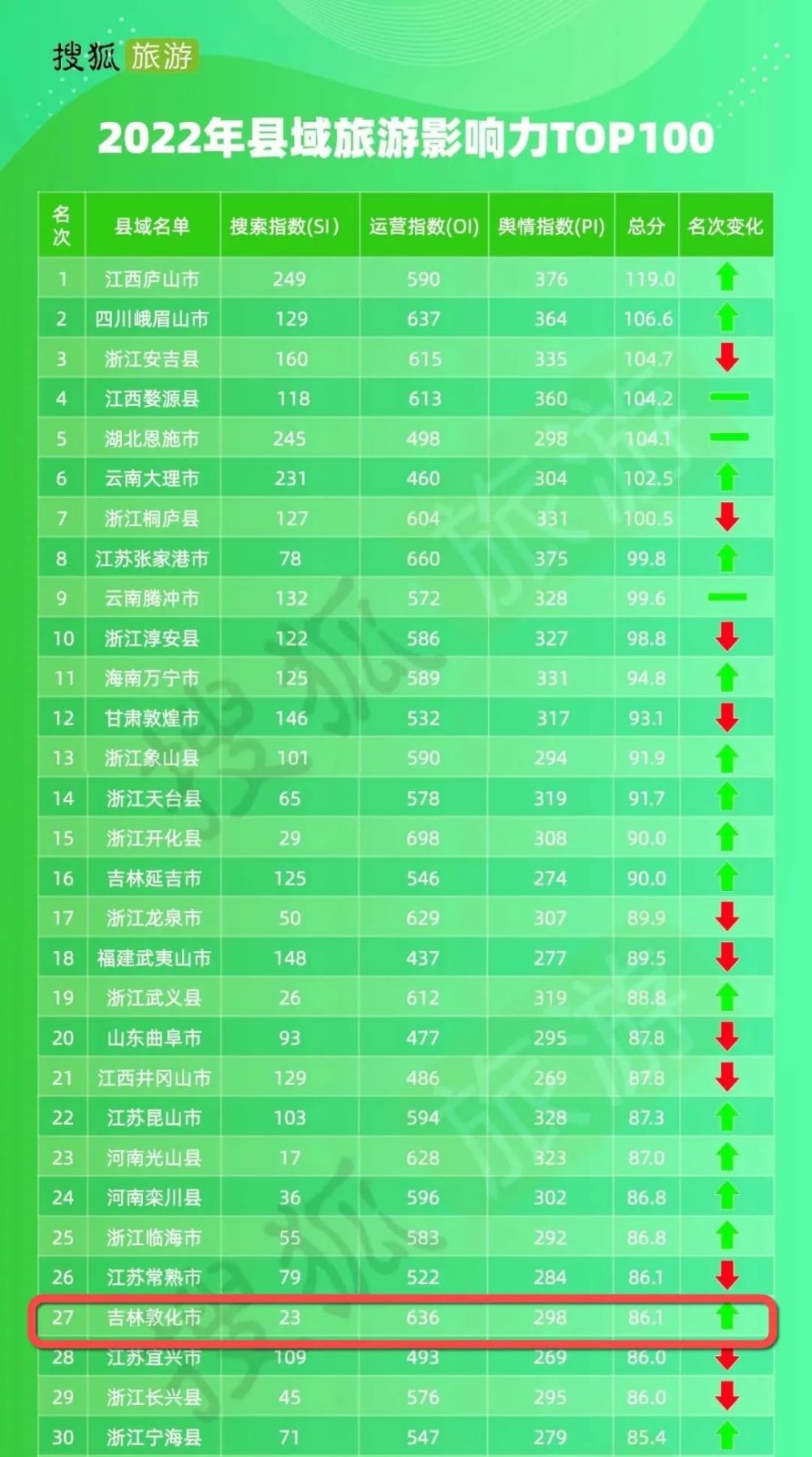 过去的2022年,搜狐旅游以《中国县域旅游竞争力报告》为蓝本,创建县域旅游影响力指数动态测评体系,综合2022一年来的数据监测报告,汇总呈现2022年县域旅游影响力百强榜单。据发布的榜单显示,敦化市成功入选2022年县域旅游影响力TOP100,排名第27名,比2021年前进63位,成为全国进位最多的县级市。